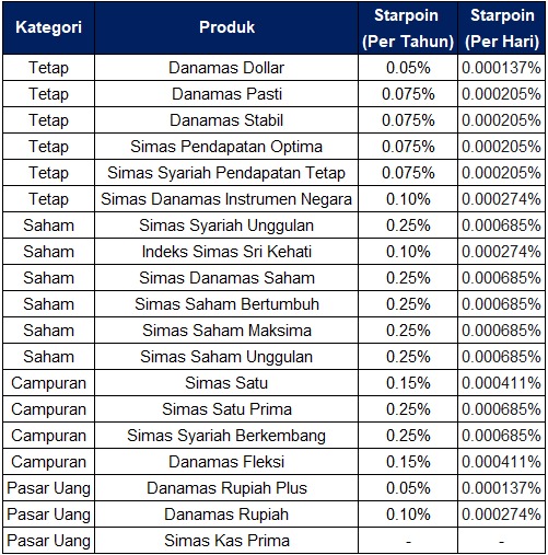 c. Nasabah akan mendapatkan Starpoin setiap harinya berdasarkan Nilai Portfolio Reksadana mereka dengan perhitungan sebagai berikut: