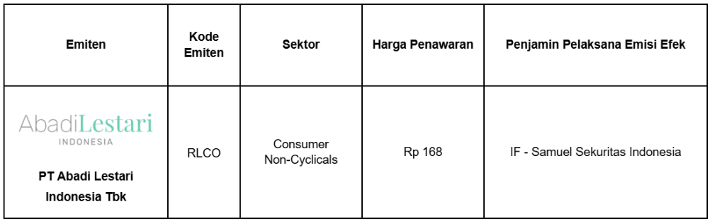 Saat ini sedang berlangsung penawaran umum perdana saham PT Abadi Lestari Indonesia Tbk (RLCO) yaitu perusahaan yang bergerak di bidang pengolahan dan pencucian sarang burung walet, serta perdagangan produk-produk kesehatan. Berikut informasi lengkapnya:
